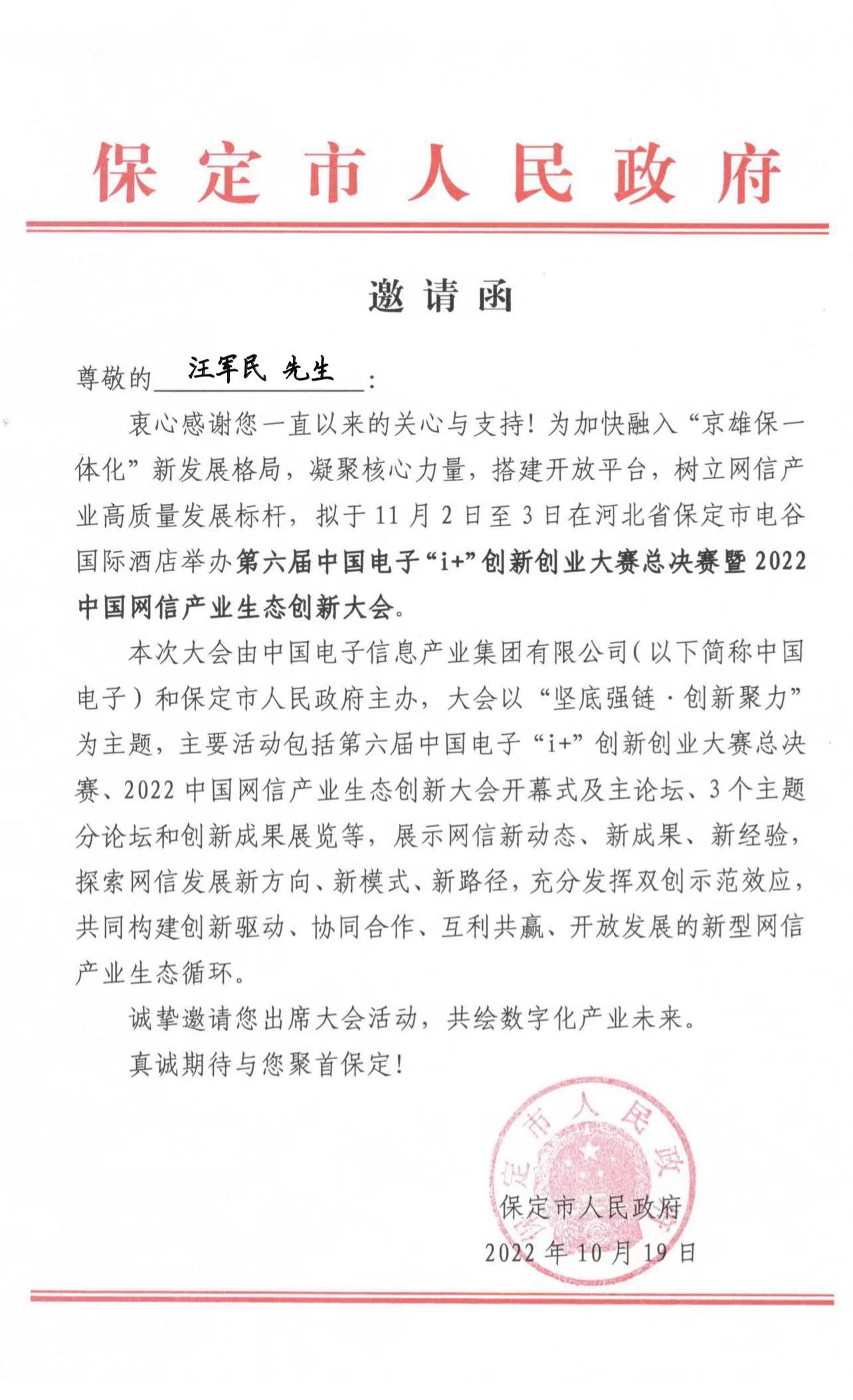 11月2日,第六届中国电子“i+”创新创业大赛总决赛在河北保定高新区成功举办。湖北长江互联网教育研究院理事长汪军民教授受邀参加第六届中国电子“i+”创新创业大赛总决赛暨中国网信产业生态创新大会并担任大赛评委。