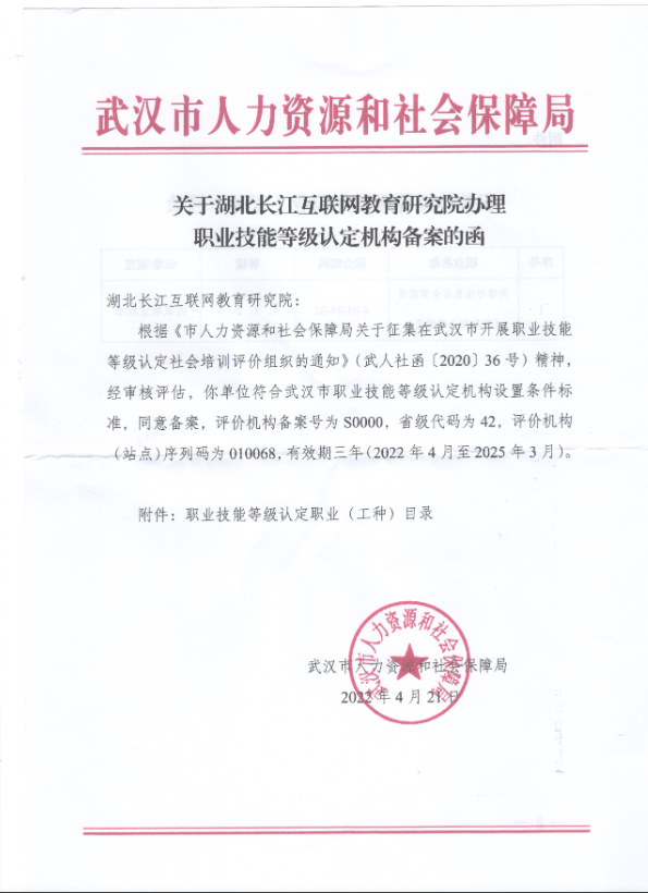 湖北长江互联网教育研究院作为人社部门备案的第三方评价机构,特此开展网络与信息安全管理员职业技能等级认定工作。