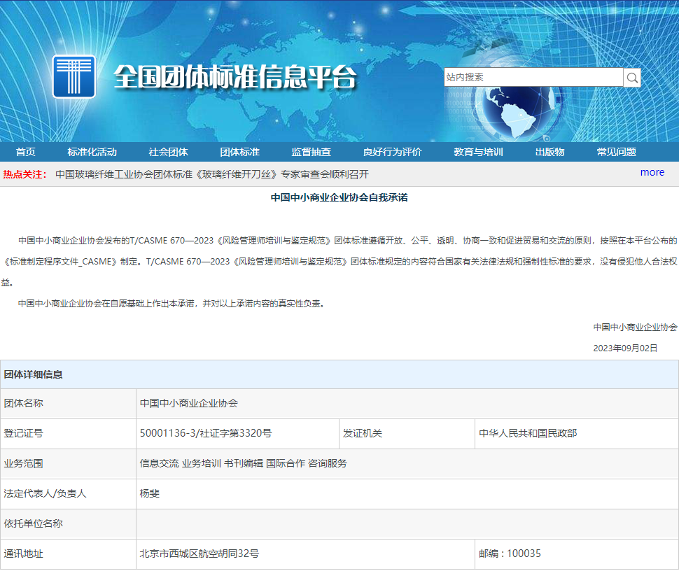 近日,湖北中潮教育科技集团有限公司、湖北长江互联网教育研究院、中南财经政法大学、武汉东湖新技术开发区中潮职业培训学校联合起草了《风险管理师培训与鉴定规范》(T/CASME 670—2023),由中国中小商业企业协会于2023年8月31日予以批准发布,并于2023年9月15日正式实施。