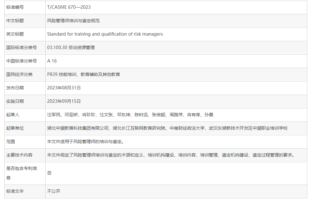 此项团体标准规定了风险管理师培训与鉴定的术语和定义、培训机构建设、培训内容、培训管理、鉴定机构建设、鉴定过程管理的要求。该标准的目的是为风险管理师的培训和鉴定提供统一的指导,确保培训课程和鉴定流程的质量和有效性,以满足市场和行业的需求,为专业人士提供高质量的培训和鉴定机会。
