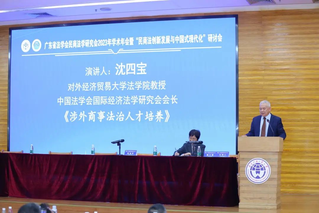 沈四宝教授的主旨演讲围绕“涉外商事法治人才培养”展开,认为:涉外法学教育需要处理好法律和实践、涉内和涉外关系,从实践中总结经验、提炼理论,以国内法为基础,培养出能实际解决问题的法律人才;法学教师队伍应当践行教学、科研、实践三位一体,形成良性发展循环;商法人才需要具备商业思维能力,实现以商带法、法商互动、合作共赢;涉外法律服务人才应当重视外语学习,理解不同文明、法律制度、价值理念的差异,读万卷书、行万里路、交万人友、懂万人心。