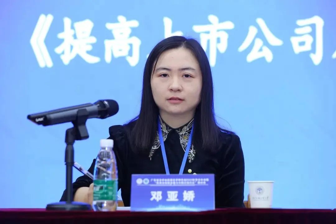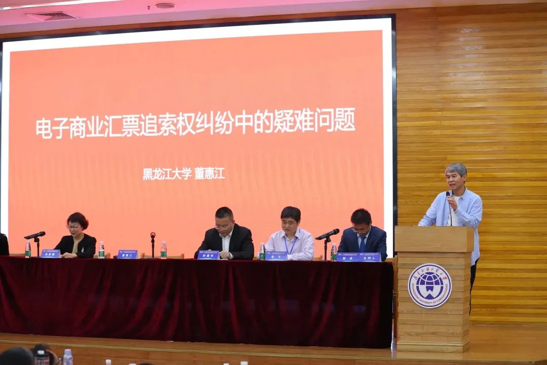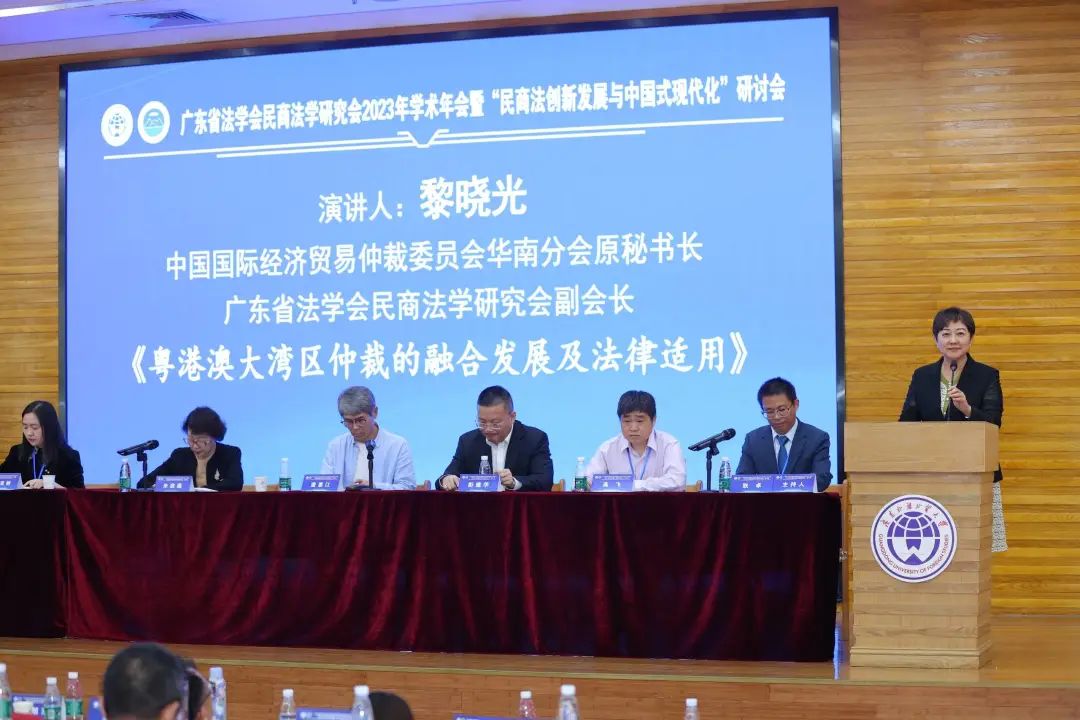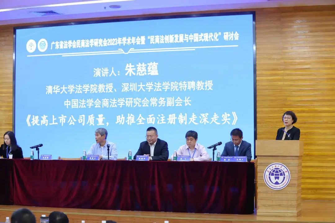 随后,大会进入专题演讲阶段。本环节由广东外语外贸大学法学院副院长耿卓教授主持,清华大学法学院教授、深圳大学法学院特聘教授、中国法学会商法学研究会常务副会长朱慈蕴以“提高上市公司质量,助推全面注册制走深走实”为主题进行演讲,黑龙江大学法学院教授、中国法学会商法学研究会常务理事、黑龙江省法学会商法学研究会会长、《北方法学》主编董惠江的演讲题目是“电子商业汇票追索权纠纷中的疑难问题”,湖北中潮教育科技集团有限公司总经理、湖北长江互联网教育研究院秘书长邓亚娇围绕“中国式现代化进程中法律复合型人才培养模式创新”进行发言,广州市南沙区人民法院彭建华院长全面介绍了“南沙自贸片区涉外商事审判改革及实践探索”,中国国际经济贸易仲裁委员会华南分会原秘书长、广东省法学会民商法学研究会副会长黎晓光以“粤港澳大湾区仲裁的融合发展及法律适用”为中心发言,广东外语外贸大学土地法制研究院教授、院长、广东省法学会民商法学研究会副会长高飞分享了关于“农村集体经济组织立法争点及其抉择”的见解。